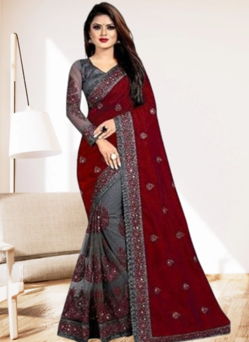 এক্সক্লুসিভ ইন্ডিয়ান ওয়েটলেস জর্জেট মেরুন/অ্যাশ এমব্রয়ডারি করা পার্টি শাড়ি